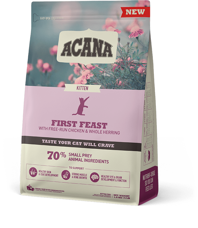 ACANA First Feast recipe is thoughtfully crafted to nurture growing kittens of all breeds. 70% quality animal ingredients like free-run chicken and herring are balanced with 30% fruit, vegetables & botanicals, to provide your kitten with the nutrients they need to support their rapid development.