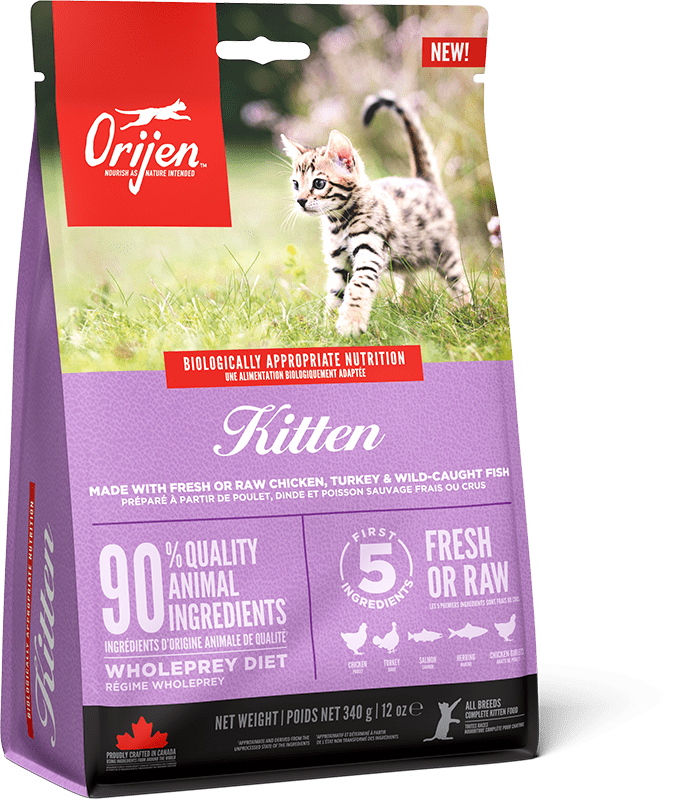 All kittens do best on a Biologically Appropriate diet: one that is rich in protein and fat from quality animal ingredients to support peak development. ORIJEN Kitten is one of our highest protein recipes, created with your kitten's health, growth and development needs in mind. Made with fresh chicken and raw salmon, ORIJEN Kitten is brimming with goodness, delivered in a smaller kibble size, specially designed for kittens.