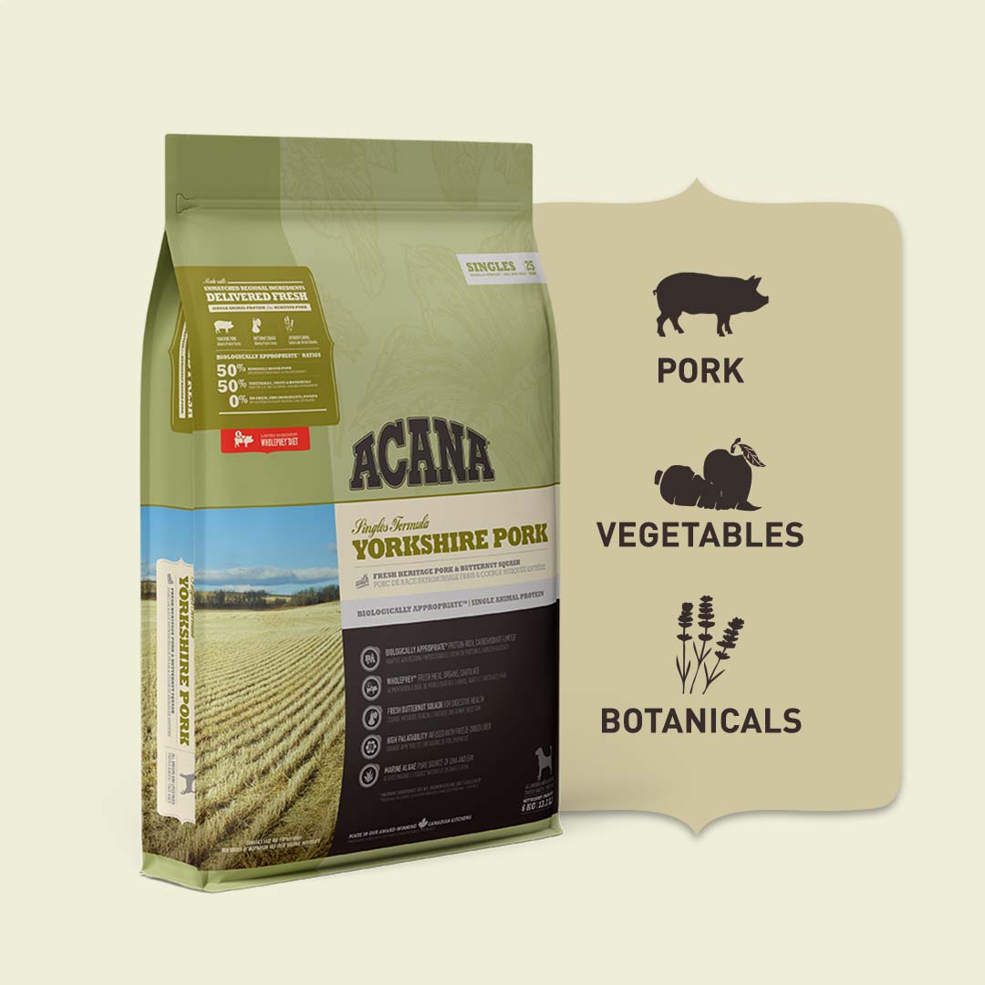 The Biologically Appropriate recipes in the ACANA Singles range are ideal for rotational feeding, especially for those dogs that do suffer from diet sensitivities. Each recipe within the range features a single protein source (hence the name ' Acana Singles') - Pork, Lamb or Duck. All diets are completely balanced to be fed alone and offer the unique opportunity to rotate between diets within the product line. Our ACANA Singles recipes are specifically designed to contain only five macro-ingredient classes with the same botanicals and low-glycemic carbohydrates allowing you to either avoid ingredients that may be causing an issue for your dog, or to add dietary variation, with less chance of gastrointestinal upset.