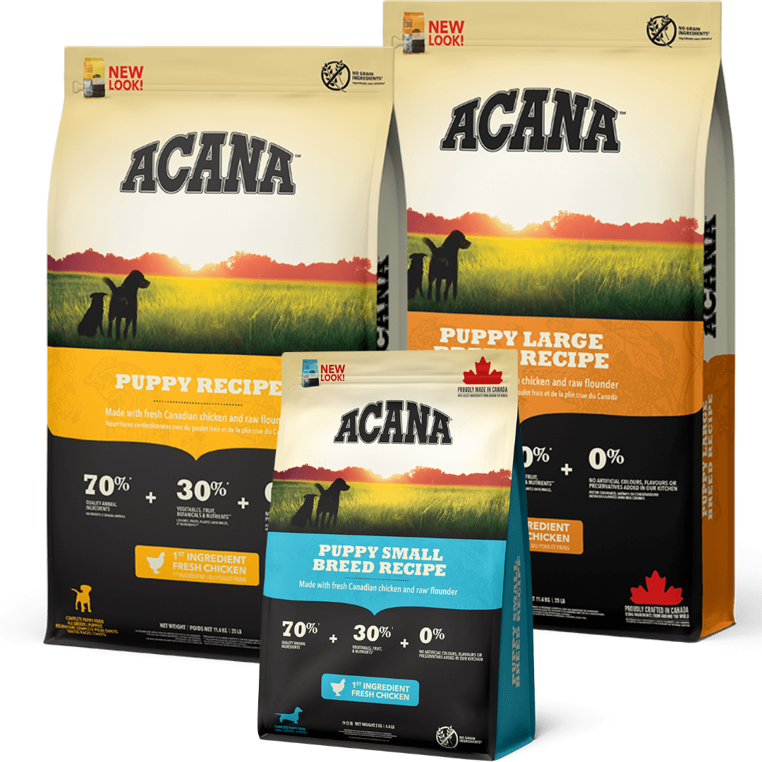Our ACANA Puppy Large Breed, Puppy Small Breed Recipe and Puppy Recipe provide your puppy with the protein and nutrition they need to support their rapid development. With quality animal ingredients balanced with fruit, vegetables and botanicals delivered daily, every meal of ACANA Puppy Recipe is like it came from the farmer’s market.
