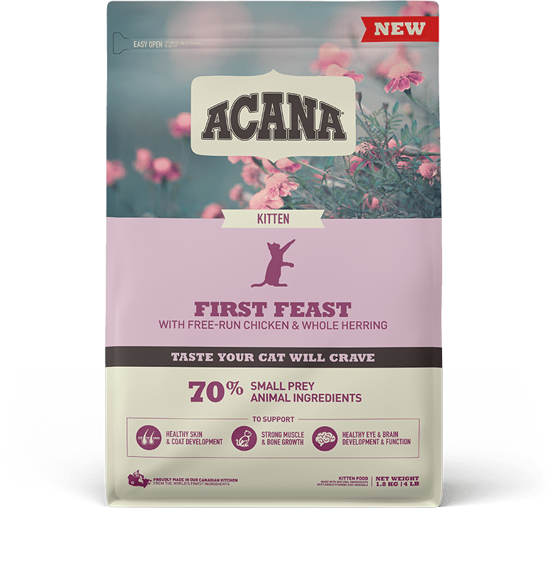 Chicken is generally an easily digestible protein for cats and is a flavour many love, so it can be a great place to start. ACANA First Feast is a nutritionally balanced chicken-based kitten recipe. ACANA Pacifica is a fish-based recipe also suitable for kittens as it is an 'all life stage' food.