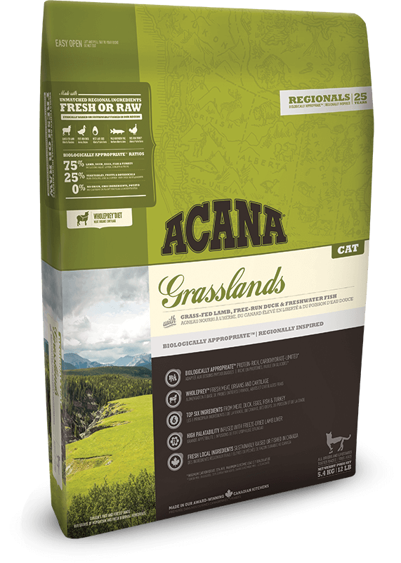 Inspired by our vast grasslands and northern lakes, ACANA Grasslands features grass-fed lamb, free-run duck, cage-free eggs, wild-caught northern pike, and free-run turkey from western Canada. Brimming with Fresh Regional Ingredients that are delivered to our kitchen fresh or raw in WholePrey ratios that mirror your cat’s evolutionary diet, ACANA Grasslands nourishes your cat naturally and completely.