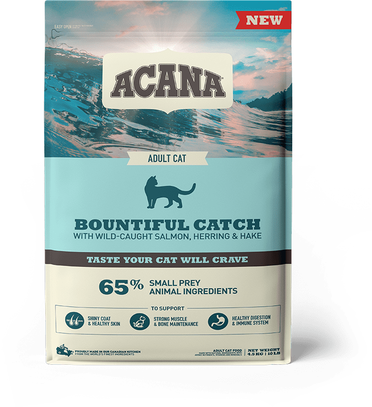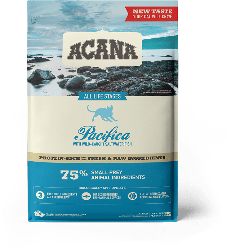 Our ACANA® cat food goes beyond the 1st ingredient™, thoughtfully crafting our recipes from start to finish. Bursting with wild-caught herring, mackerel, flounder, hake, and rockfish in WholePrey ratios of fish, organs, and bone, ACANA Pacifica naturally delivers the nutrients your cat requires for peak health, nourishing them the way Mother Nature intended.