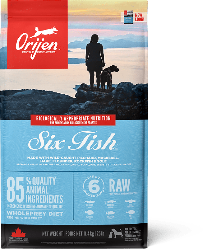 ORIJEN® Six Fish recipe is made with a variety of succulent whole, wild-caught fish including fresh Pacific Pilchard, Mackerel, Hake, Flounder, Rockfish & Sole. With 38% richly nourishing protein, and 85% quality animal ingredients, ORIJEN Six Fish nourishes dogs of all life stages according to their evolutionary and biological needs. ORIJEN Six Fish provides more calories from protein and fat and fewer from carbohydrates, providing a calorie distribution that mirrors the natural diet, reducing the risk of obesity and diabetes.