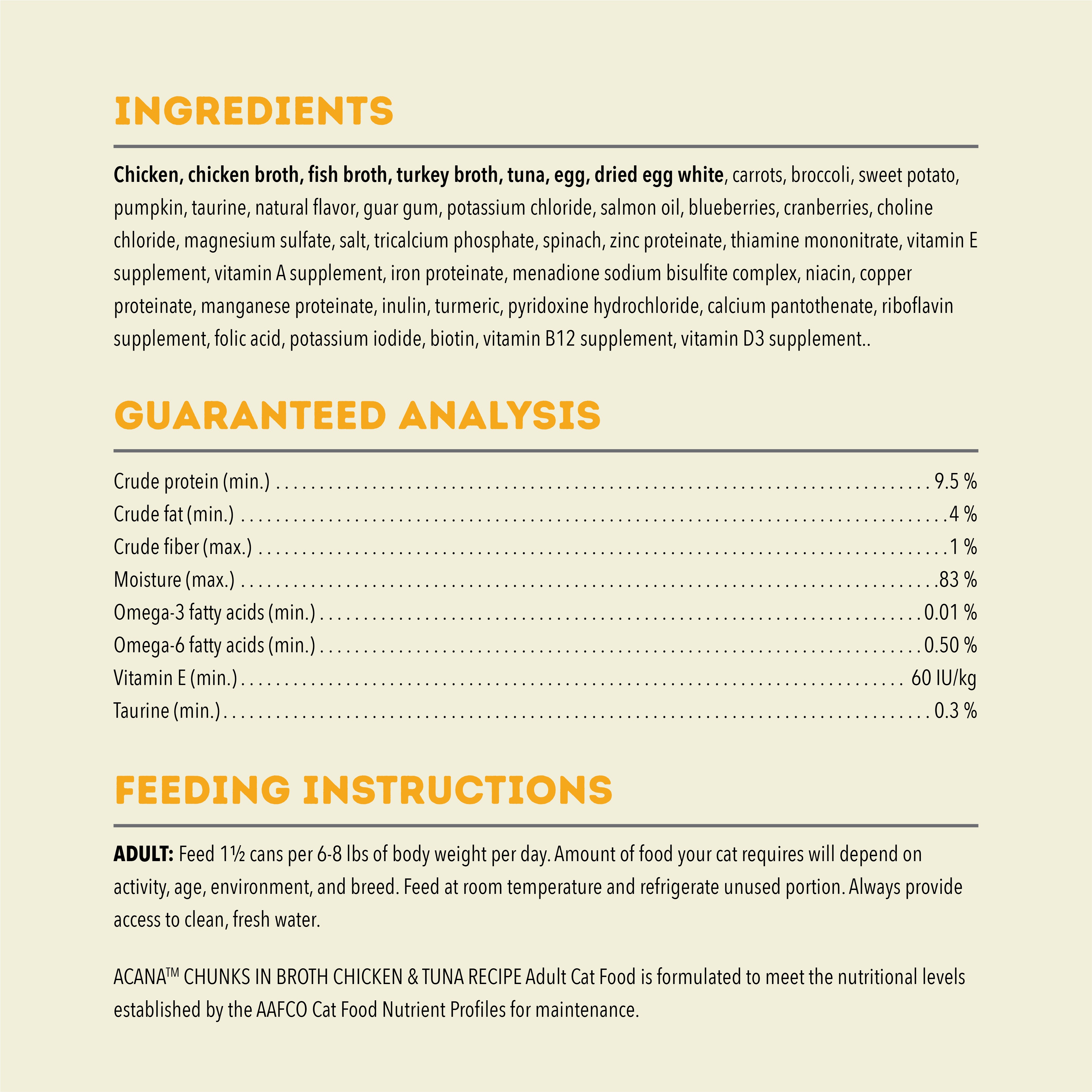 Nurture your cat with the protein-rich animal ingredients and delicious bone broth in ACANA™ Chunks in Broth wet cat food! Crafted with 85% animal ingredients*, Chicken & Tuna Recipe provides your cat with the nourishing animal protein they crave. Each can features nourishing animal ingredients, including savoury chicken and tuna, in satisfying chunks. It also includes hydrating chicken, fish and turkey broths to tantalise your cat’s tastebuds and provide them with the moisture they need. It also helps support your cat’s immune health and skin & coat health. Nurture your cat with a wet cat food that helps them feel so good inside, you’ll see it on the outside! *Exclusive of water; approximate value.