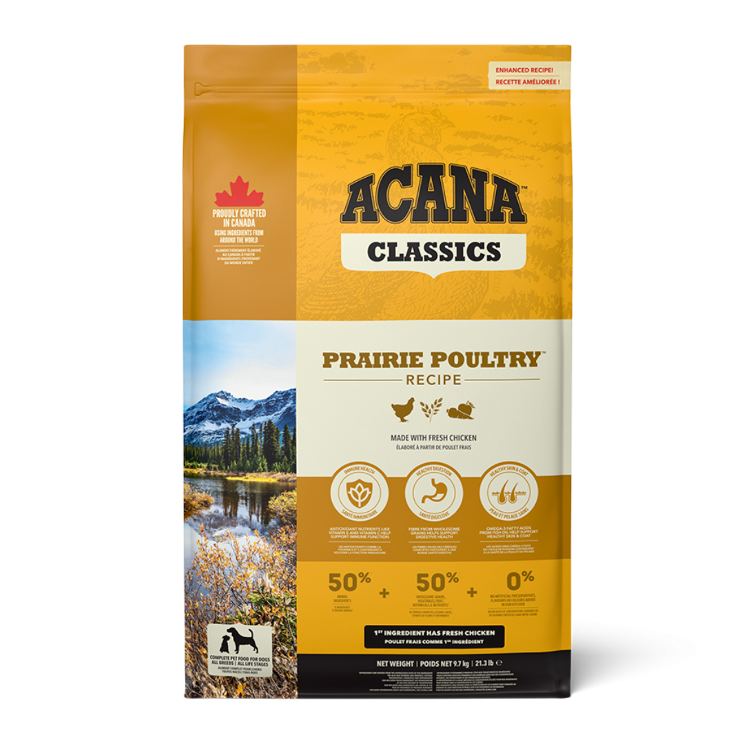 Give your dog the goodness of simple, balanced nutrition with ACANA™ Classics Prairie Poultry. Crafted with a 50/50 blend of quality poultry ingredients and wholesome fruits, grains, and vegetables, this recipe delivers hearty flavour and premium nutrition in every bite. With nutrient-dense ingredients to support immune health, digestion, and a healthy skin and coat, it’s a great everyday choice for keeping your dog happy and healthy.