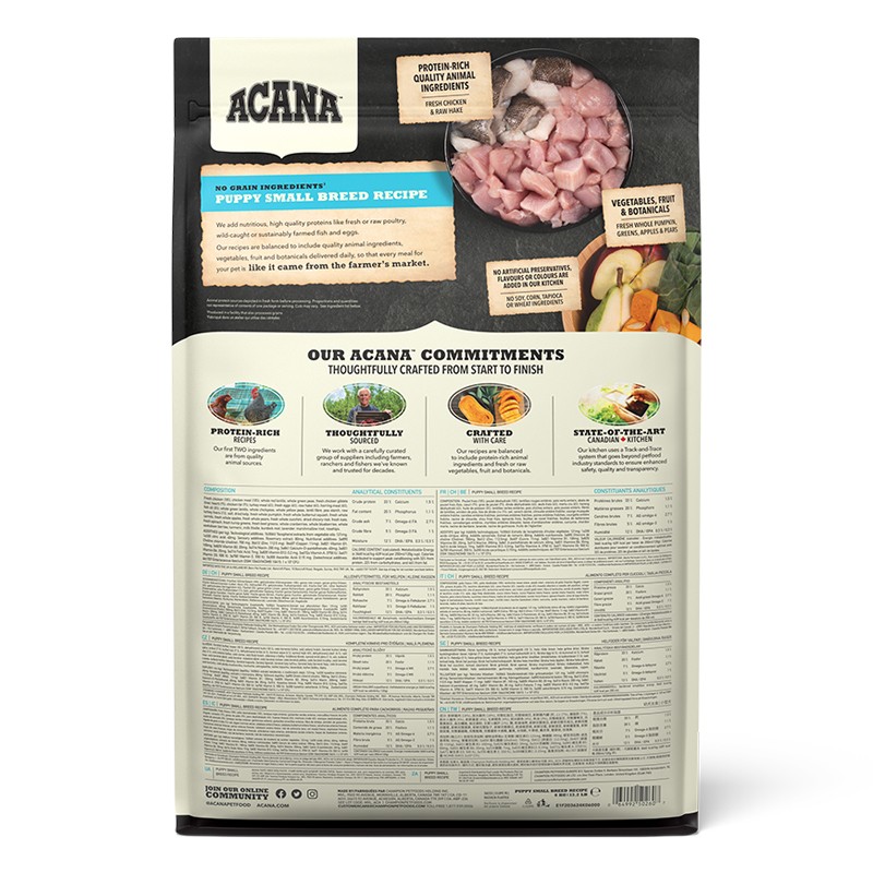 ACANA™ Small Breed Puppy is specially crafted with 70% quality animal ingredients, like fresh free-run chicken and raw fish, that help nurture your puppy’s growth and development. With 30% wholesome fruits, vegetables, and botanicals, this recipe fuels your puppy’s energy needs while supporting healthy bones, brain development, and a healthy coat. Every bite is packed with premium ingredients—carefully balanced to help your puppy thrive from the very beginning.