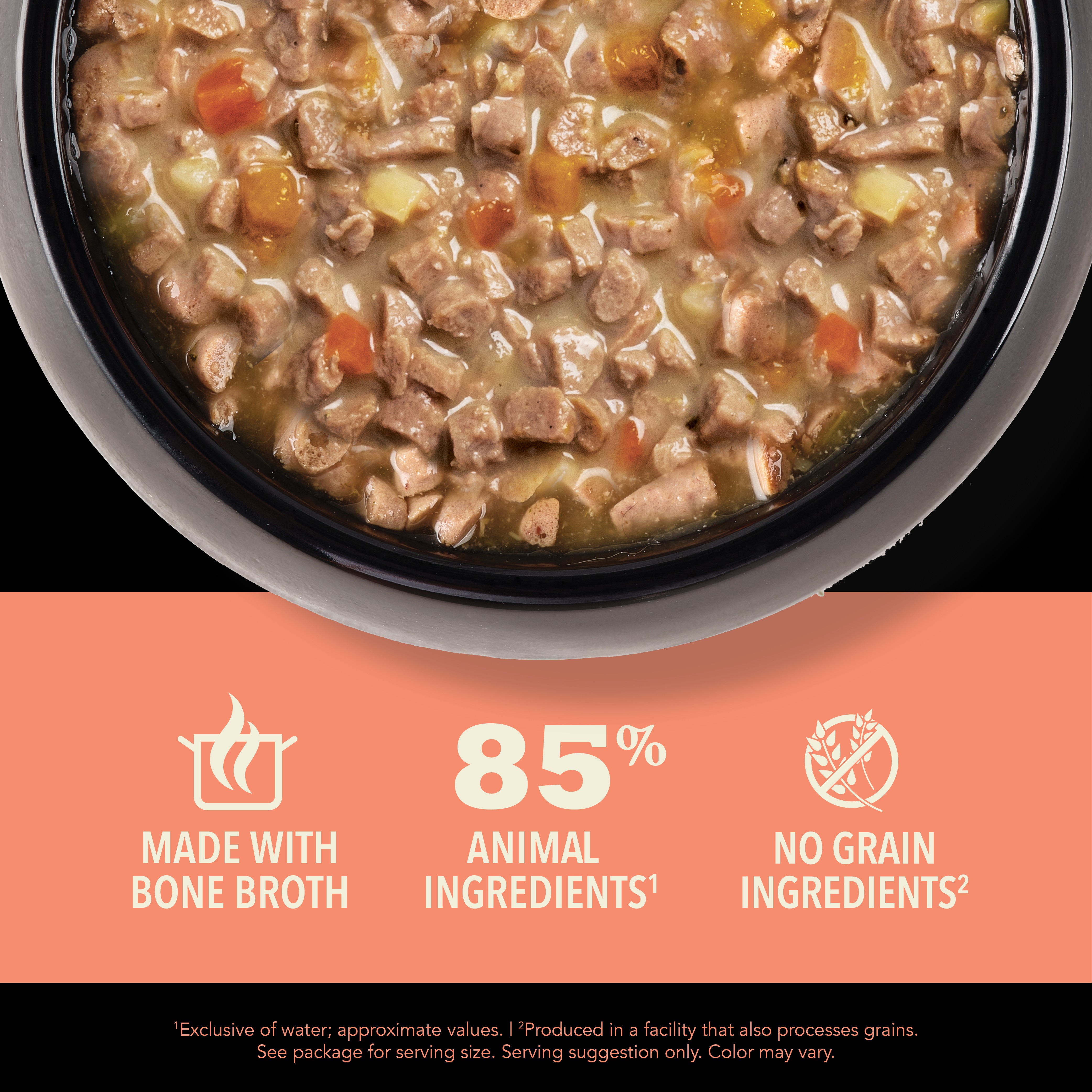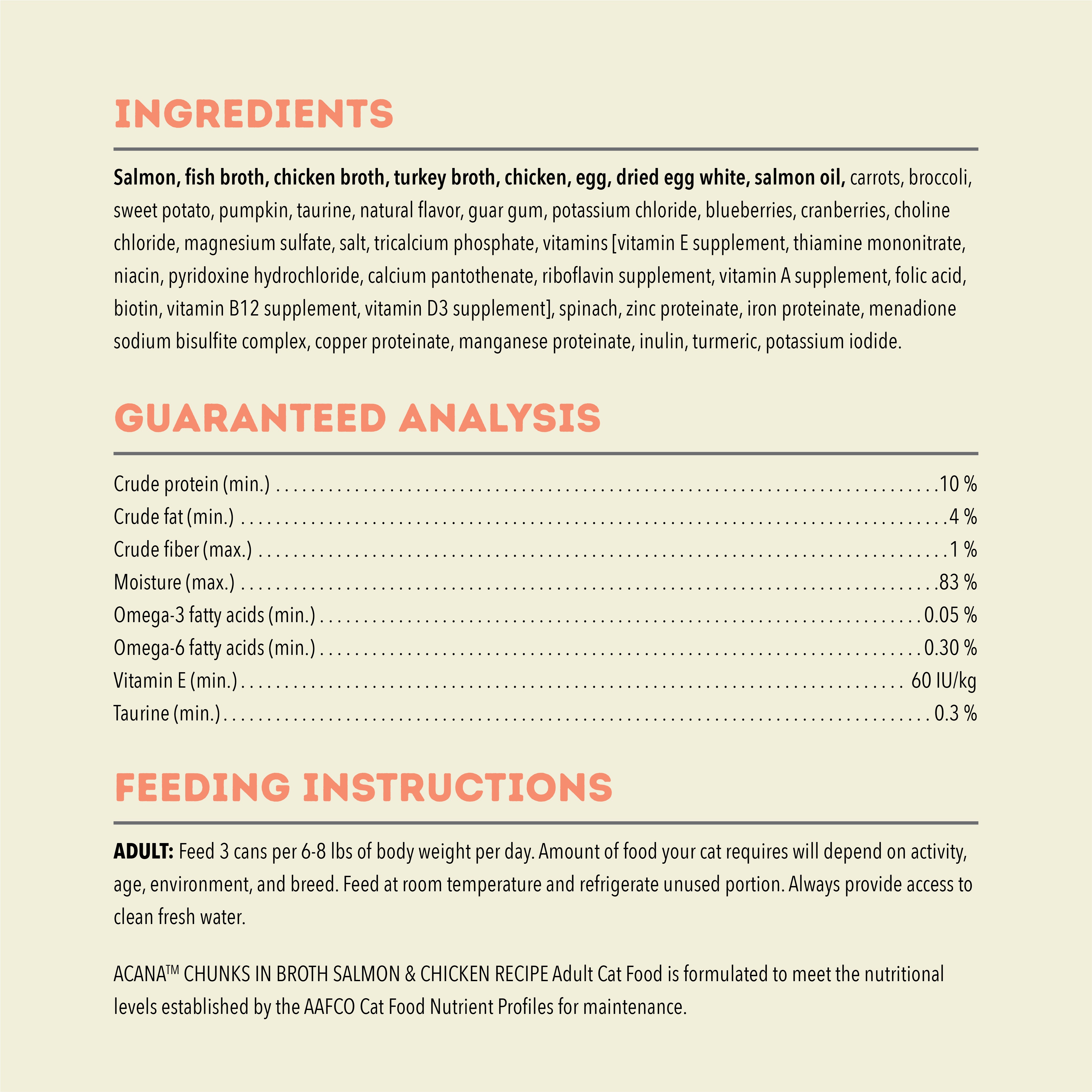 Nurture your cat with the protein-rich animal ingredients and delicious bone broth in ACANA™ Chunks in Broth wet cat food! Crafted with 85% animal ingredients*, Salmon & Chicken Recipe provides your cat with the nourishing animal protein they crave. Each can features nourishing animal ingredients, including savoury salmon and chicken, in satisfying chunks. It also includes hydrating fish, chicken and turkey broths to tantalise your cat’s tastebuds and provide them with the moisture they need. It also helps support your cat’s immune health and skin & coat health. Nurture your cat with a wet cat food that helps them feel so good inside, you’ll see it on the outside!