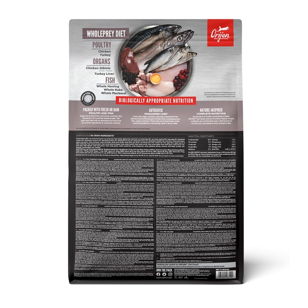 - WHOLEPREY ANIMAL INGREDIENTS: Featuring WholePrey ratios of meat, organs, cartilage or bone—plus whole fish and cage-free eggs—ORIJEN provides the nutrients your dog needs to thrive.