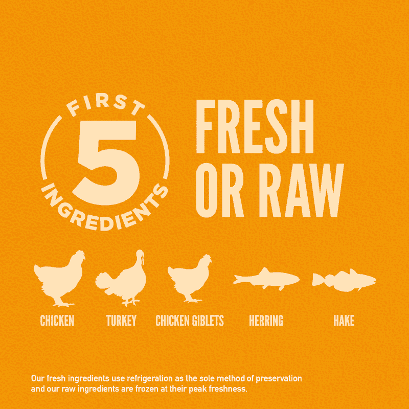 • FRESH OR RAW: 2/3 of ORIJEN's meat is FRESH (refrigerated) or RAW (frozen at the peak of freshness) to preserve nutrients.