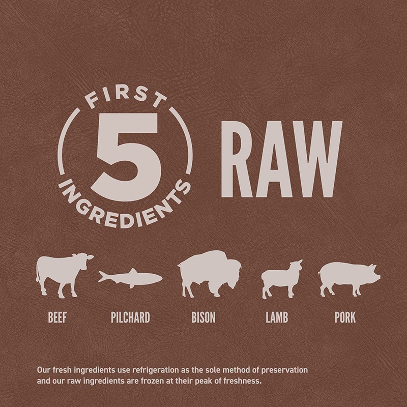 • FRESH OR RAW: 2/3 of ORIJEN’s meat is FRESH (refrigerated) or RAW (frozen at the peak of freshness) to preserve nutrients.