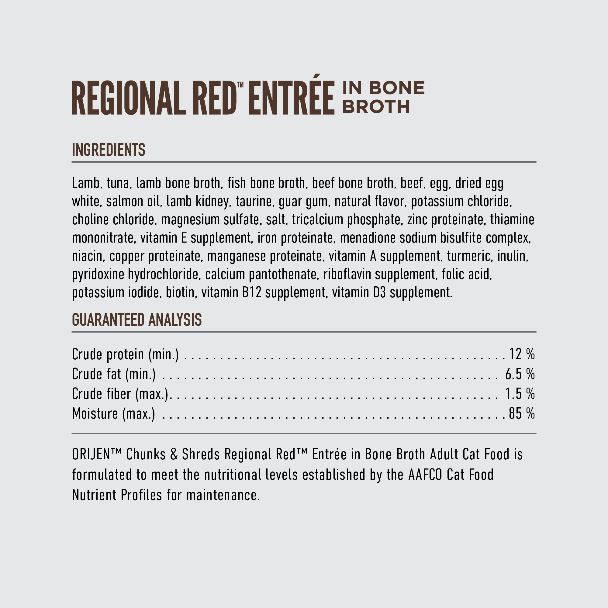Nourish your cat completely with hearty WholePrey animal ingredients and real shreds of meat, poultry or fish in ORIJEN™ Chunks & Shreds Wet Cat Food! Cats are obligate carnivores, so they thrive off a diet packed with animal ingredients. That’s why Regional Red Entrée recipe includes a whopping 95% animal ingredients¹ including lamb and tuna, to provide your cat with the Biologically Appropriate nourishment they were born to eat. This diet also includes succulent WholePrey ingredients like lamb kidney to provide your cat with rich and varied nutrients. Bone broth helps support your cat’s hydration, while also adding tempting flavour. Nourish your cat with the texture and variety of raw animal ingredients packed into every can of ORIJEN™ Chunks & Shreds.