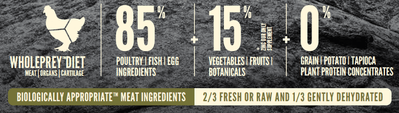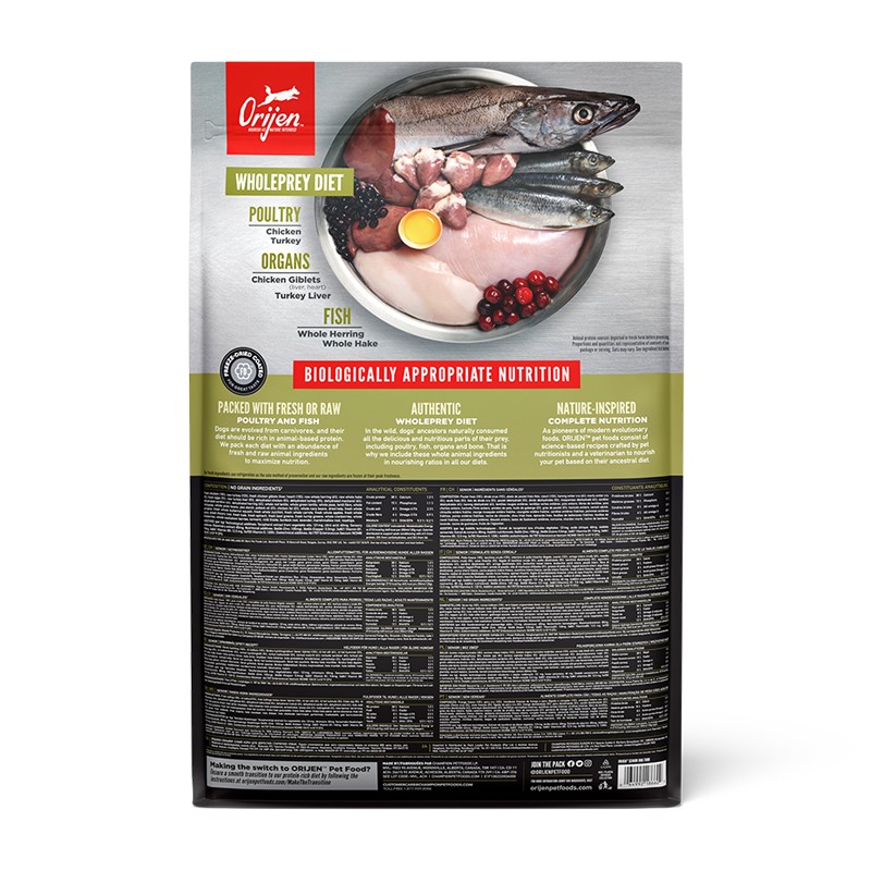 - WHOLEPREY ANIMAL INGREDIENTS: Featuring WholePrey ratios of meat, organs, cartilage or bone—plus whole fish and cage-free eggs—ORIJEN provides the nutrients your dog needs to thrive.